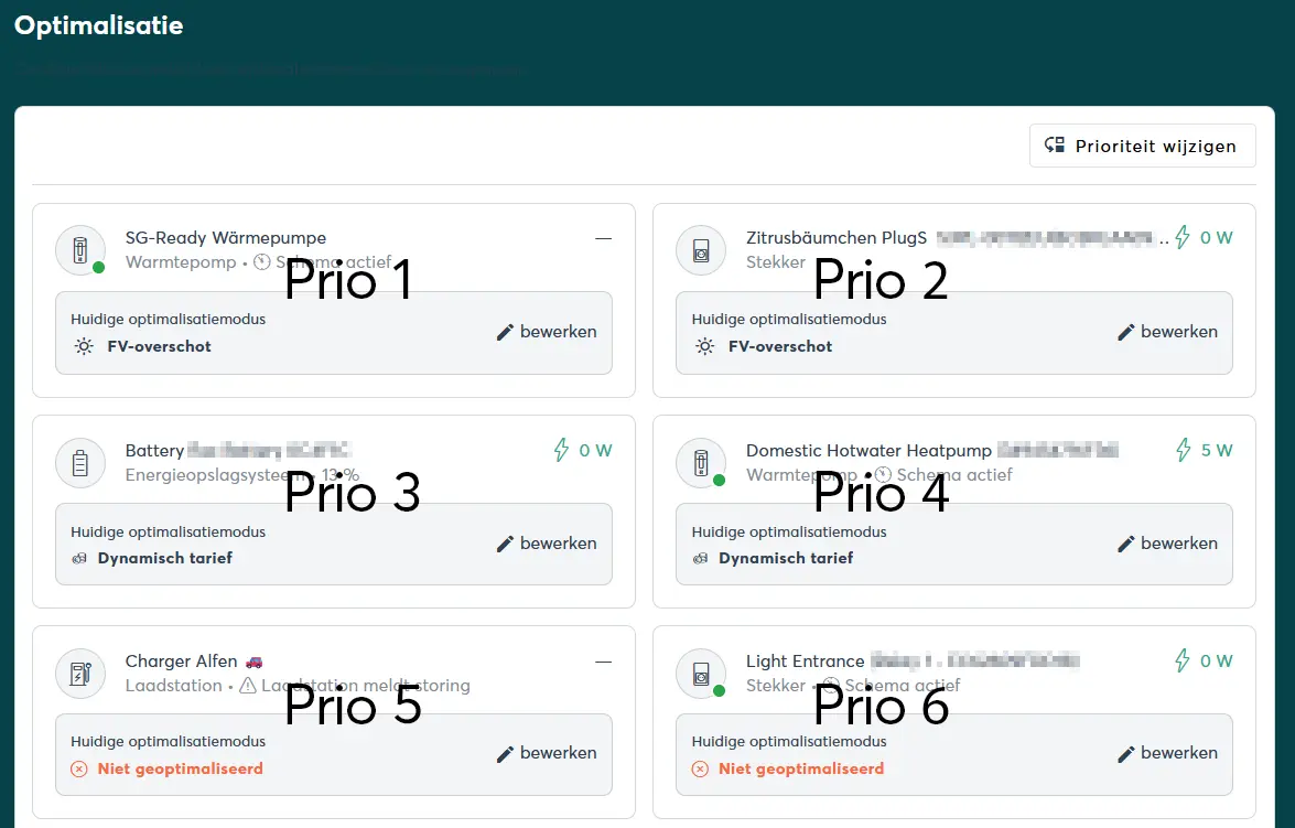 In het menu Optimalisatie heb je toegang tot alle apparaten die zijn aangesloten op de Manager, kun je prioriteit geven aan deze apparaten en looptijden instellen.