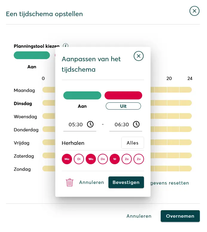 Je kunt ook een schema maken voor elk apparaat. Dit heeft altijd voorrang op PV-optimalisatie. Je kunt het schema gebruiken om de tijden te definiëren waarop het apparaat moet worden in- en uitgeschakeld.