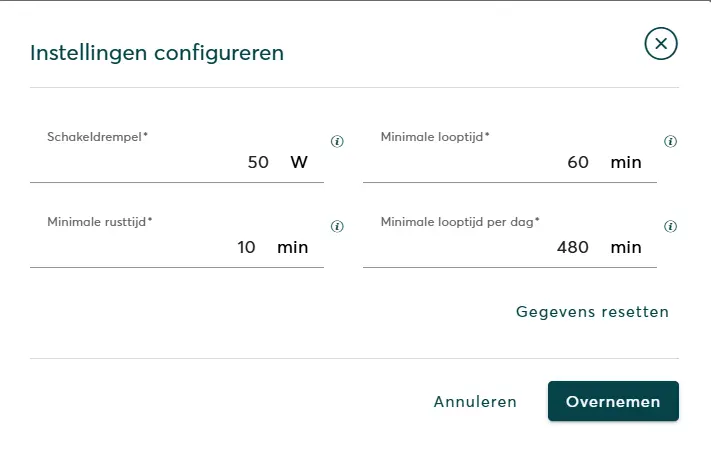 - Minimale looptijd - de minimale duur dat een apparaat moet werken voordat het weer kan worden uitgeschakeld. Dit is nodig voor sommige apparaten, omdat ze beschadigd kunnen raken als ze constant worden in- en uitgeschakeld. Een warmtepomp moet bijvoorbeeld minstens 10 minuten per keer draaien, zelfs als dit betekent dat er energie van het elektriciteitsnet moet worden afgenomen.