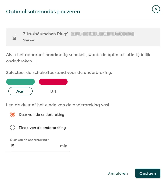 De optimalisatie van het PV-overschot kan tijdelijk worden onderbroken voor alle apparaten (behalve warmtepompen). Klik hiervoor op Aanpassen en vervolgens op Apparaat handmatig in- of uitschakelen.